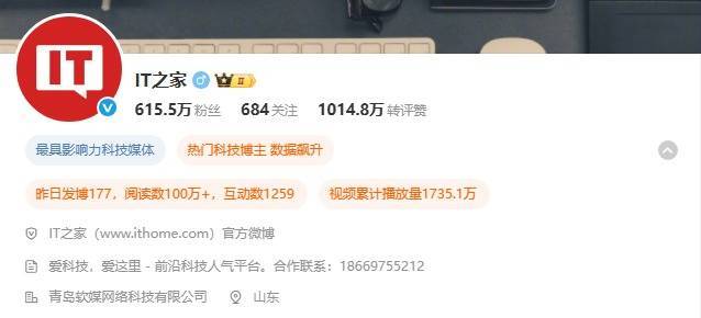 @IT之家 微博已收获 615.5 万粉丝关注,拥有“最具影响力科技媒体”、“热门科技博主”称号。